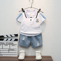 This charming baby boy's outfit features a crisp white shirt paired with matching shorts, perfect for warm weather occasions. Crafted from soft, breathable fabric, it ensures comfort for your little one while maintaining a stylish appearance. The ensemble is neatly displayed on a rustic wooden shelf, highlighting its timeless appeal and suitability for both casual and special events. Ideal for parents seeking a versatile addition to their child's wardrobe.
